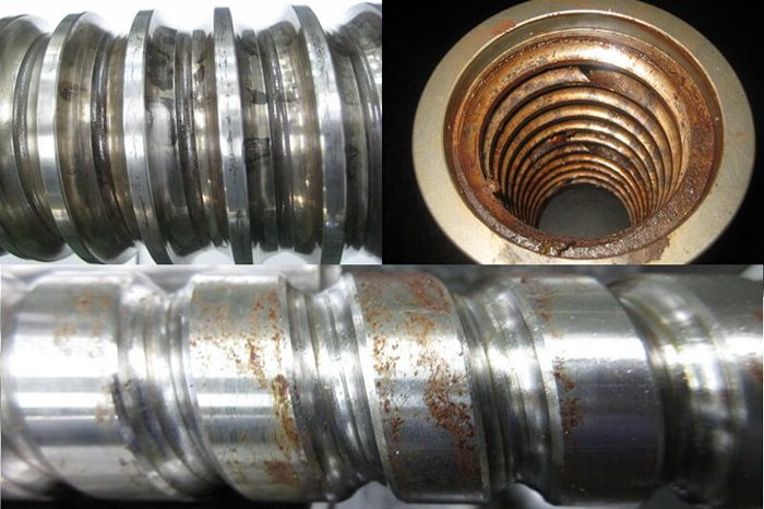 含水性的液體或處于高溫差、高濕度的環境下,水氣導致絲杠產生銹斑,在長時間運轉后甚至會導致大面積的生銹。