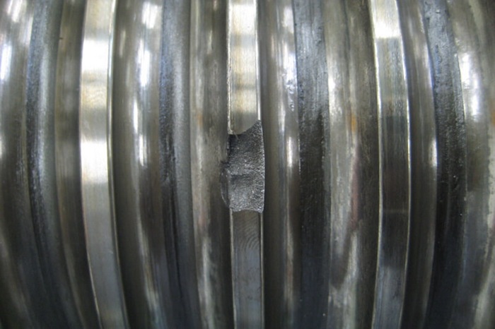 承受過大的負荷導致鋼珠迴流不順暢,使得螺紋面承受力集中在一起,超出絲杠可承受負荷范圍后,最終導致表面崩裂,進而產生破裂。