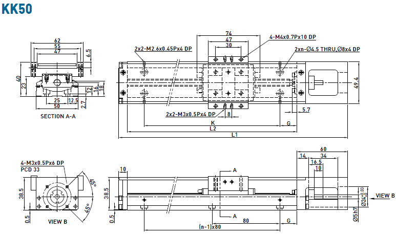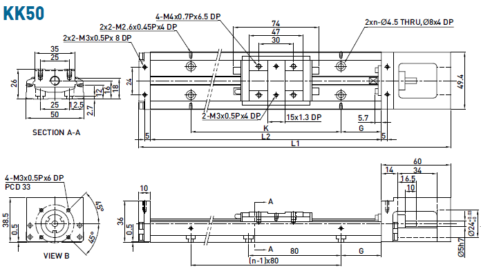 不含護(hù)蓋的KK50單軸機(jī)器人詳細(xì)尺寸介紹: